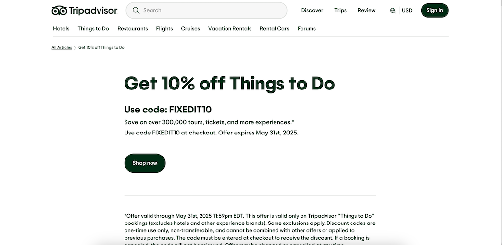 Vil du gerne rejse snart og har brug for en hurtig gevinst? Her er nogle aktive TripAdvisor-tilbud som stadig er gyldige: